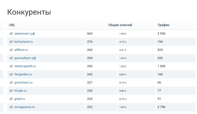 Выбирая конкурентов обращайте внимание не только на данные трафика, но и на % общих ключей с вашим сайтом (чем выше этот показатель, тем релевантнее конкурент). Откройте каждый сайт и присмотритесь точно ли он является конкурентом в вашей тематике. Бывает, что среди конкурентов попадаются сайты из смежных тематик и рассматривать их в качестве конкурента не стоит.