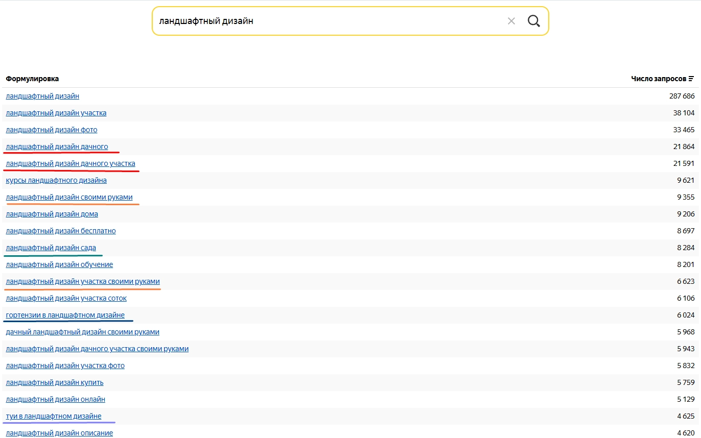 Повтор цвета означает, что запросы относятся к одной теме.