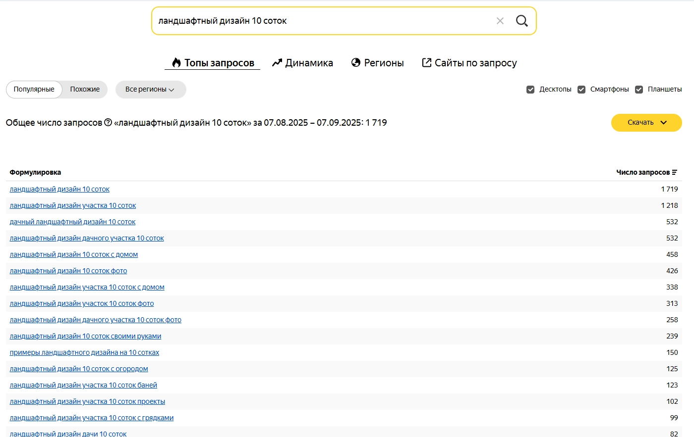 Сервис выдает список запрос и указывает базовую частоту каждого запроса.