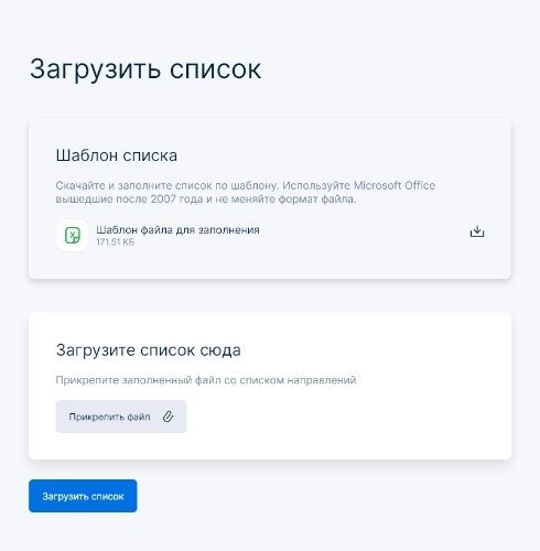 - Менеджер может формировать список направлений в файле Excel, а потом загружать его в личном кабинете;