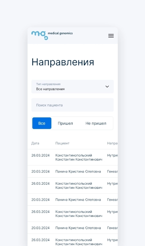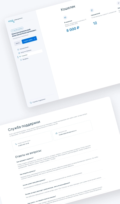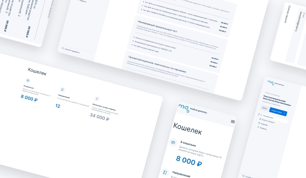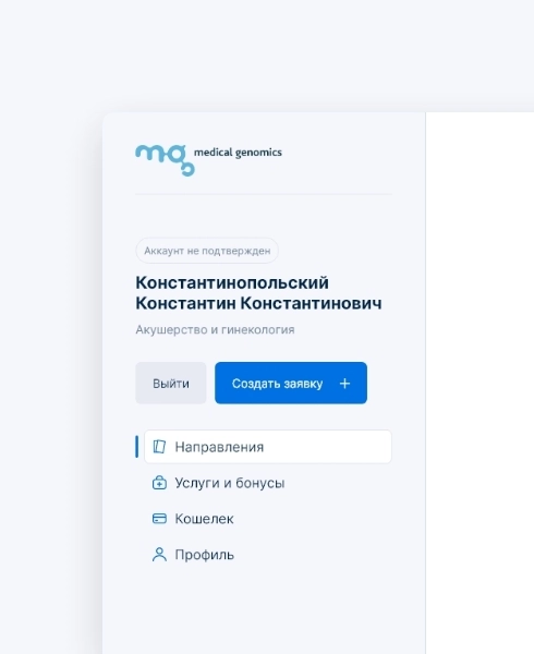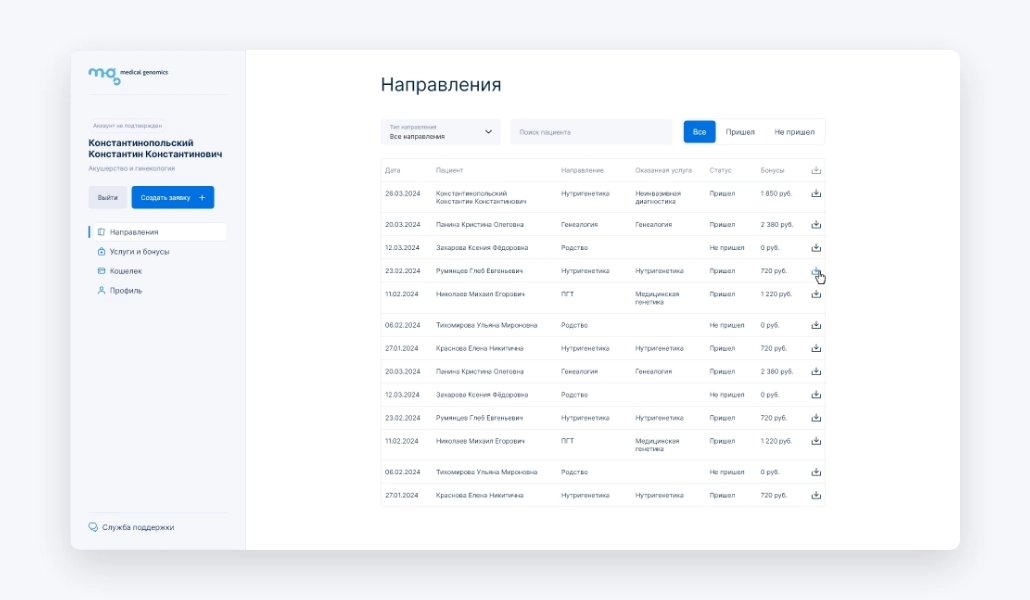 Генетическая лаборатория «Medical Genomics» запустила реферальную программу для врачей из частных и государственных клиник. Для них мы разработали личный кабинет, в котором можно отметить направление пациента в лабораторию и отслеживать вознаграждение.