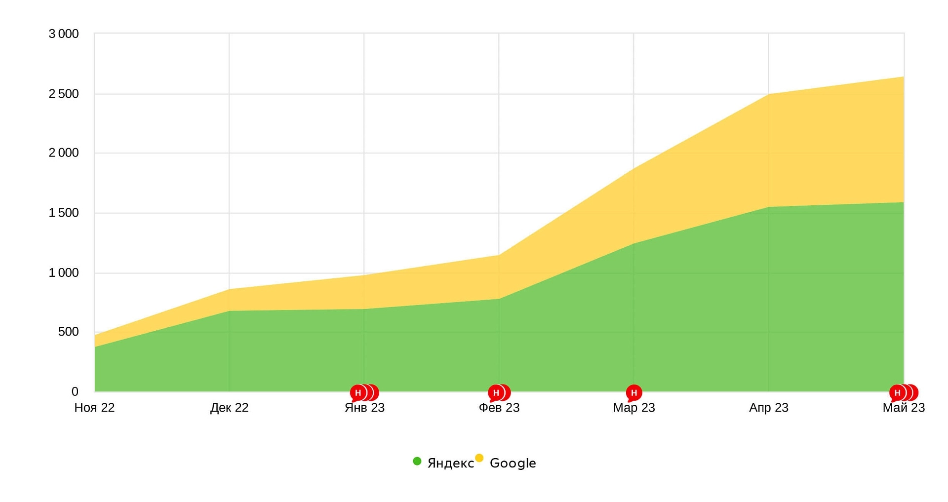 На скриншоте из яндекс метрики представлен рост переходов из поисковых систем.