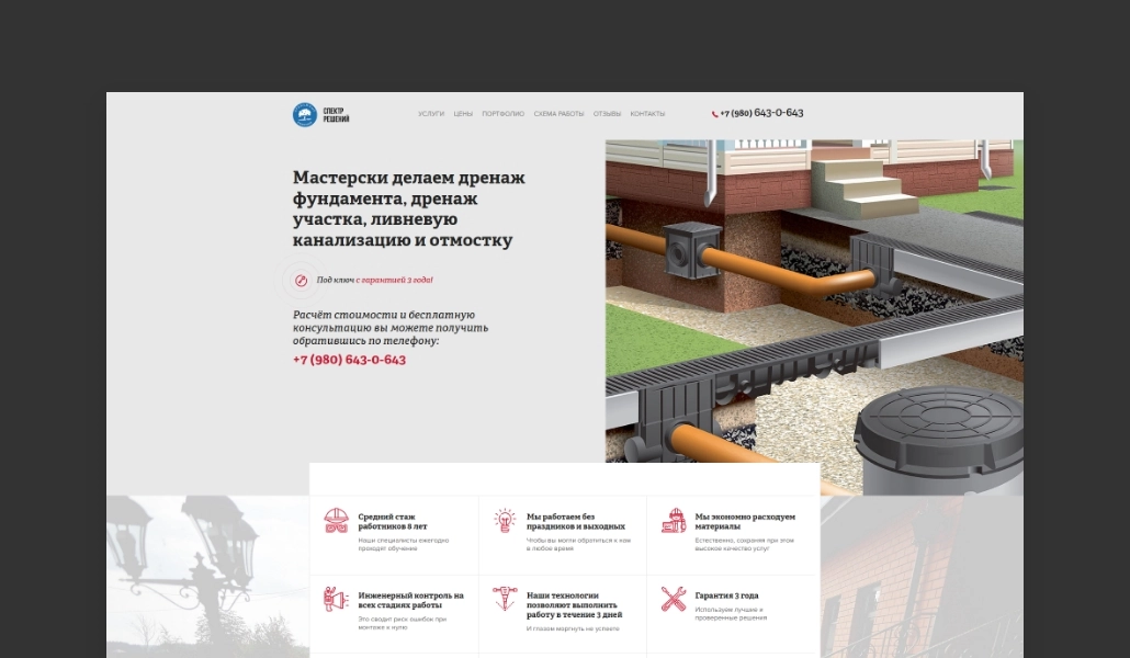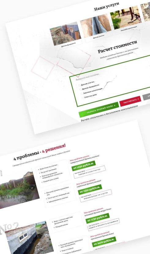 После успешной работы с предыдущим проектом компания поручила нам разработку сайта для проекта связанного с услугами по монтажу дренажных систем. На сайте несколько посадочных страниц с информацией о услугах и выполненных работах. Также на страницах мы создали калькулятор расчета стоимости услуг и настроили контекстную рекламу. Ссылка на сайт