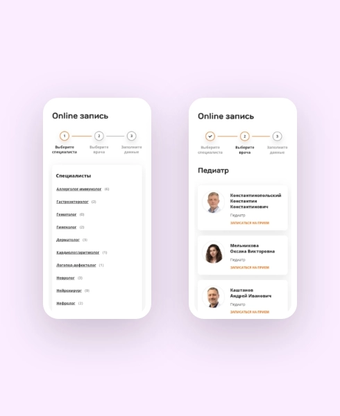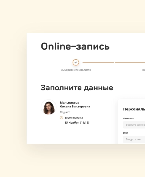 Онлайн запись проходит в несколько шагов. От пользователя требуется только основная информация, ничего лишнего. Можно записаться к конкретному врачу или на прием нужного специалиста (например, окулиста).
